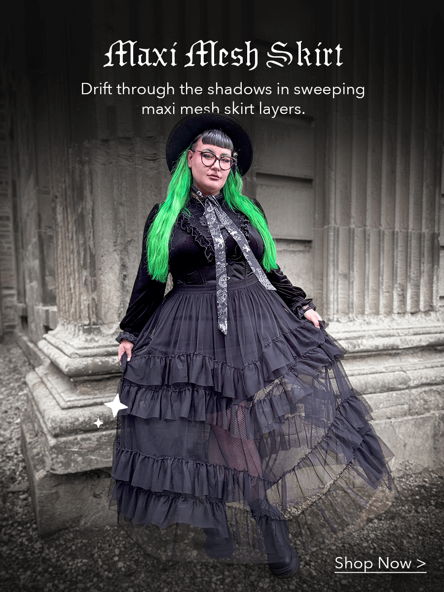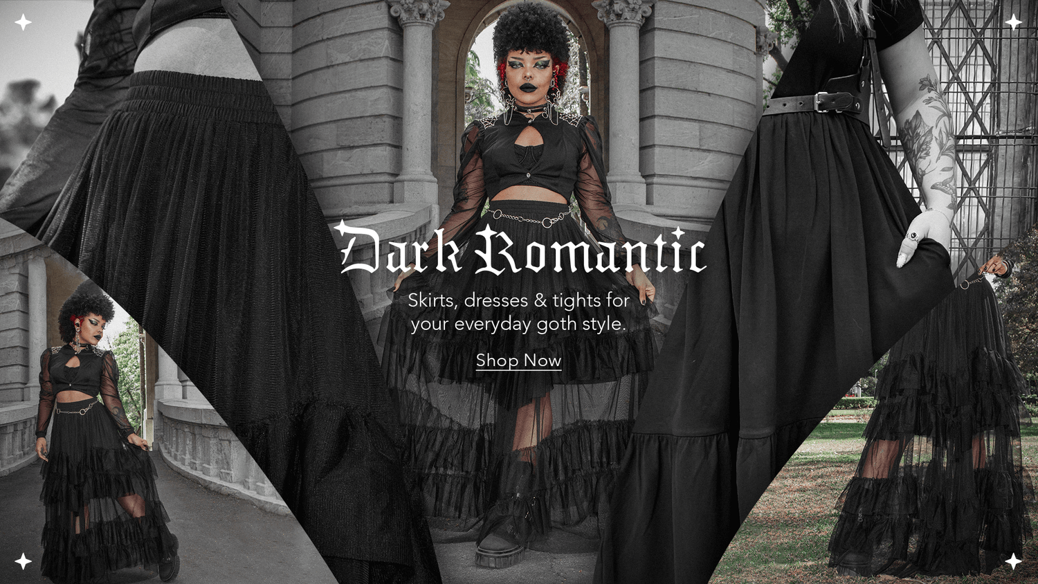 Our Dark Romantic collection is packed with statement black dresses, incredible skirts, and unique alternative tights, all designed for your bold self expression. With floaty tulle maxi skirts, dresses to die for, and the fishnet tights to pair perfectly, there's a combo here to steal your heart. This collection comes alive with a punk attitude and a big pair of chunky boots. Goth essentials in every size, ready to make your own.