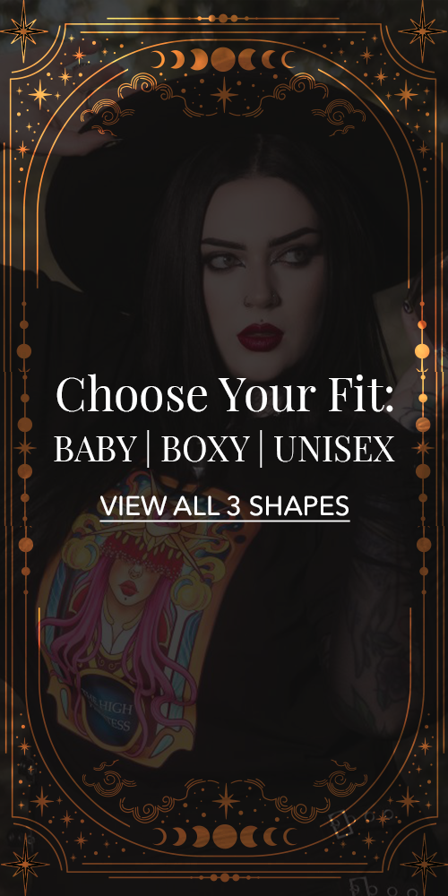 Find your arcana in our super-soft organic cotton tees: choose hope with The Star Unisex T-shirt, or classic comfort with the oversized Judgement Unisex Tee. For new silhouettes, go for positivity with The Sun Baby Tee (a fitted, cropped cut), or explore your intuition with The Moon Baby Tee. If you're drawn to the new cropped Boxy shape, choose mystery with the High Priestess or dance in the shadows with The Devil Boxy Tees.