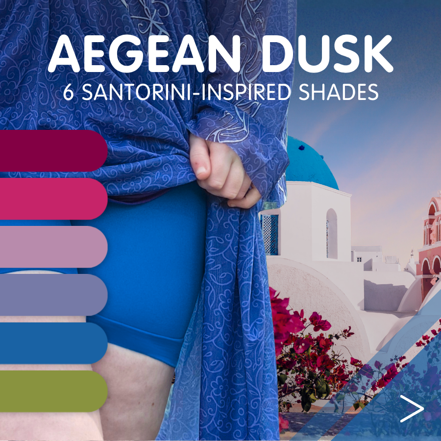 The best holiday moments happen when you aren’t thinking about your clothes. I chose these shades to mirror the flow of your holiday. Vivid Shore brights match the high energy of the midday sun. Aegean Dusk tones are for those quiet hazy evenings when the heat finally breaks.