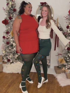Say hello to Fairy Lights, the whimsical tights that add a pop of colour and personality to any outfit. On a rich Bottle Green 80 denier base, playful coils of multicoloured lights spiral up the legs, giving a polished front view with a cheeky twist at the back.