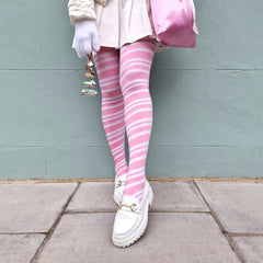 ✨ Creamy white 80 denier base with soft pastel pink stripes