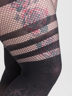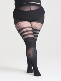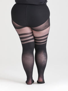 With a black opaque leg, that ends at the thigh, there are then sheer panels at the top of the legs with three stripes, this give the illusion of hold ups or striped thigh high socks. But these sheer panels are made from our super robust fishnet (the same as our sell out Brad tights). Perfect for peeking out under a skirt or dress, Ashniko are you new favourite black tights.