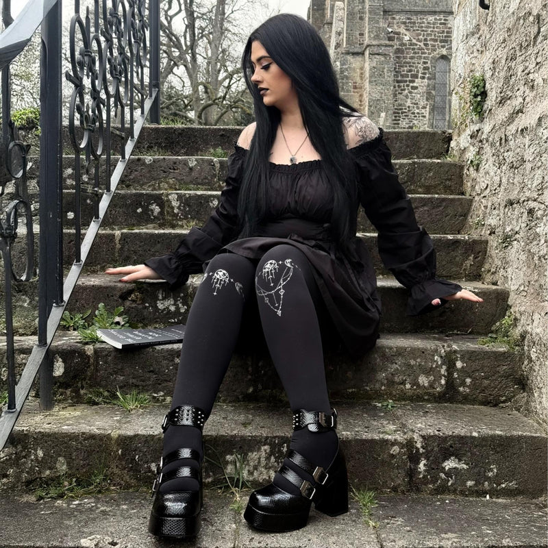 Calling all witches! The Coven tights are here for all your midnight rituals. A beautiful, silvery glitter pattern sits just above the knee, like a magical charm to ward off bad vibes.