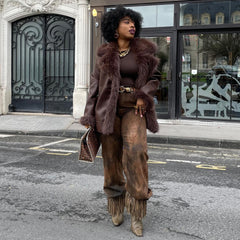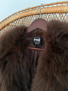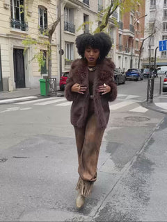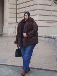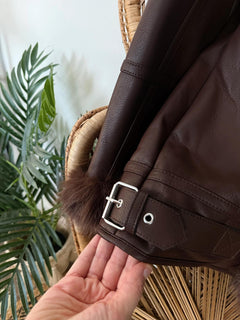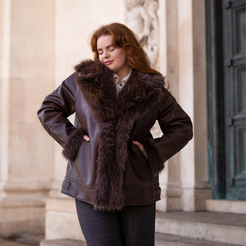 Get ready to fall head over heels for the Amelia Aviator Jacket in Brown faux fur. This longer-line aviator is crafted from smooth vegan PU faux leather in the most delicious deep brown, then lined from collar to hem in the softest, cosiest faux fur we have ever created. One touch and you will understand why this feels like pure luxury wrapped around you.