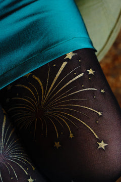 Light up the night with every step. Glitter Fireworks 80 denier tights are a full-body celebration, with shimmering silver and gold firework bursts and scattered stars dancing across a deep black base. Bold, playful and made to sparkle, these tights turn movement into a moment and every outfit into an occasion.