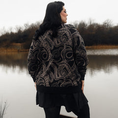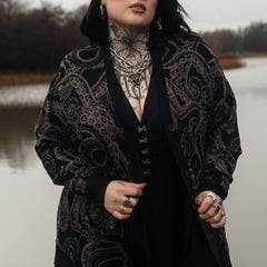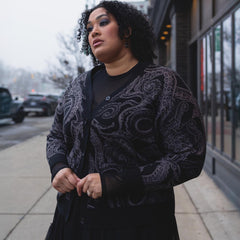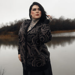 The Kraken's Embrace Cardigan is a mesmerising knit inspired by the mysteries of the deep. Our talented in-house team designed this detailed pattern, featuring slate-drawn tentacles twisting across a rich black base. It's a quietly striking alternative piece that rewards a closer look.