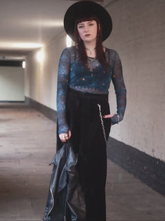 The scoop neck and long sleeves keep you covered while teasing just a hint of your curves or whatever cheeky layer lies beneath. Slip it on once and you are instantly transported to a galaxy of style that feels like wearing the night sky on a clear winter evening. Team it with a black tank underneath for everyday modesty , or vamp it up with your favourite bra or lingerie for a bolder vibe. From day to night, pair it with your go-to skirt and heels for club-ready sparkle, or throw it over jeans and boots to bring a touch of the cosmos into your daily adventures.