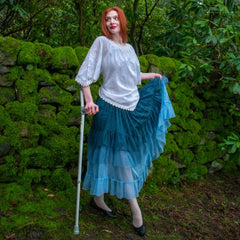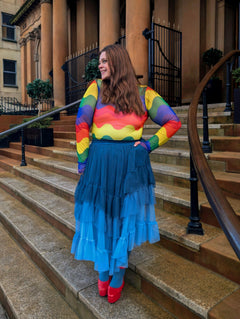Three ocean-kissed shades of blue, one seriously beautiful skirt. The Ombre Mesh Maxi Skirt in Blue flows from Ice Blast, a frosty baby blue at the hem, drifting into Denim, a soft faded blue inspired by your favourite worn-in jeans, and finishing with Bone China, a deep blue with a hint of teal that echoes the watery depths of Delftware.