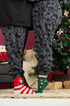 Hundreds of grinning skulls swirl across an inky base, giving proper moody vampire-lair energy. The set features our new boxy short-sleeve tee, cropped to sit just above the belly button so it kisses the high-waisted bottoms perfectly (no chilly gaps here). The bottoms are cuffed at the ankle with a comfy elasticated drawstring waist that feels like the gentlest midnight embrace.