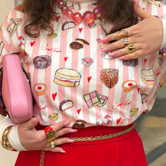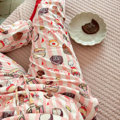 Our Sweet Treat PJ Set makes bedtime feel like the best tea party ever. It is a proper celebration of Britain’s finest cakes and puddings (think Battenberg, Bakewell tart, Victoria sponge, chocolate Swiss roll, trifle, French fancies and a scattering of tiny hearts) all tumbling across soft pink and white candy stripes.