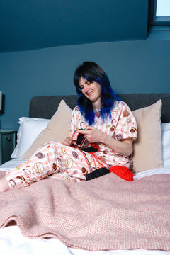 Designed in-house by the brilliant Corina, it’s pure sugar-rush joy in pyjama form. The set features our new boxy short-sleeve tee, cropped to sit just above the belly button so it meets perfectly with the high-waisted bottoms (no chilly gaps here). The bottoms are cuffed at the ankle with a comfy elasticated drawstring waist that feels like a gentle hug.